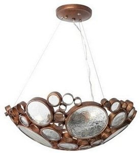 Finish:Hammered Ore, Light Bulb:(3)100w A19 Med F Incand Breathtaking... that's what came to mind when we saw the ruins of an old Nevada mine at sunset. The walls had been constructed of wine bottles and mud. All those old bottles arranged so perfectly and capturing the sunlight, what better inspiration for a lighting family? We mimicked the bottle ends with recycled steel circles of varying sizes filled with recycled glass discs. Rarely before has a design based in 'old' seemed so powerfully new. Hand forged recycled steel. Recycled glass. Aircraft cable suspension. Note: The electrical wires can be clipped to an aircraft cable (clips provided), snaked up the center, or pulled tight into a straight line up the center to create various looks.